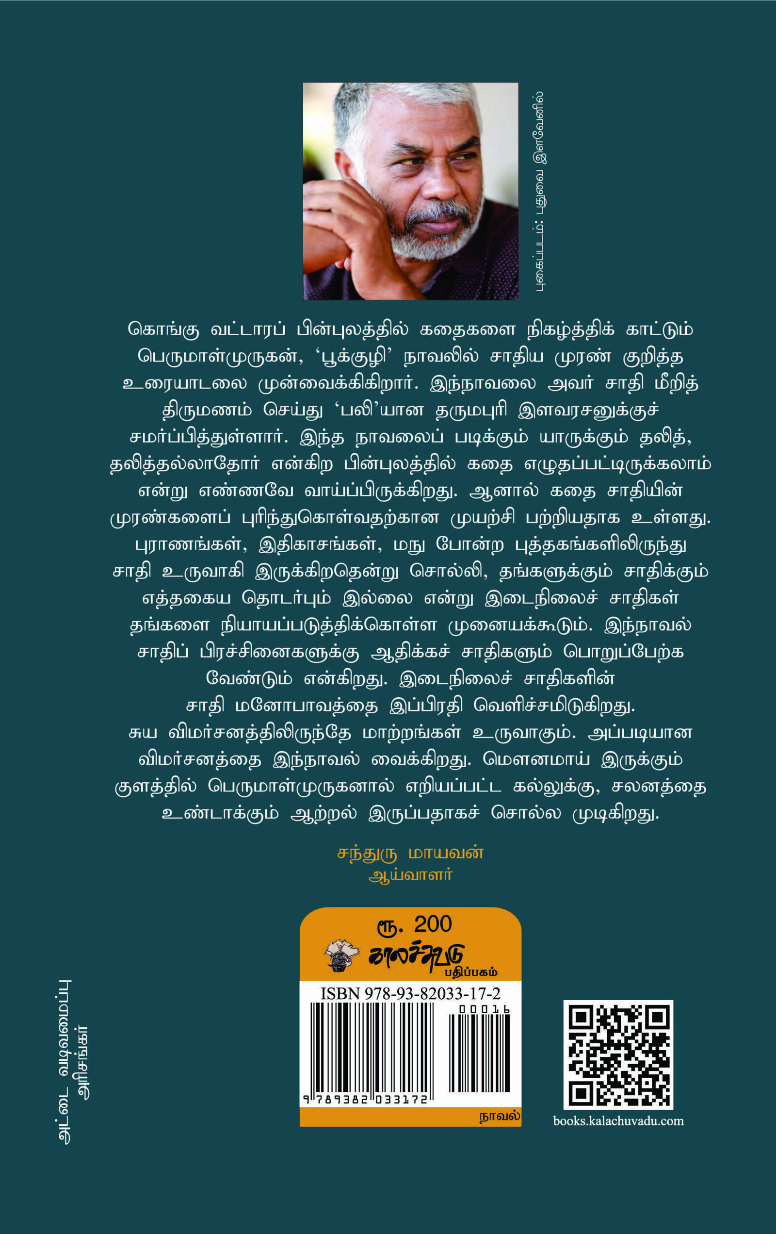 கொங்கு வட்டாரப் பின்புலத்தில் கதைகளை நிகழ்த்திக் காட்டும் பெருமாள்முருகன், ‘பூக்குழி' நாவலில் சாதிய முரண் குறித்த உரையாடலை முன்வைக்கிகிறார். இந்நாவலை அவர் சாதி மீறித் திருமணம் செய்து ‘பலி'யான தருமபுரி இளவரசனுக்குச் சமர்ப்பித்துள்ளார். இந்த நாவலைப் படிக்கும் யாருக்கும் தலித், தலித்தல்லாதோர் என்கிற பின்புலத்தில் கதை எழுதப்பட்டிருக்கலாம் என்று எண்ணவே வாய்ப்பிருக்கிறது. ஆனால் கதை சாதியின் முரண்களைப் புரிந்துகொள்வதற்கான முயற்சி பற்றியதாக உள்ளது. புராணங்கள், இதிகாசங்கள், மநு போன்ற புத்தகங்களிலிருந்து சாதி உருவாகி இருக்கிறதென்று சொல்லி, தங்களுக்கும் சாதிக்கும் எத்தகைய தொடர்பும் இல்லை என்று இடைநிலைச் சாதிகள் தங்களை நியாயப்படுத்திக்கொள்ள முனையக்கூடும். இந்நாவல் சாதிப் பிரச்சினைகளுக்கு ஆதிக்கச் சாதிகளும் பொறுப்பேற்க வேண்டும் என்கிறது. இடைநிலைச் சாதிகளின் சாதி மனோபாவத்தை இப்பிரதி வெளிச்சமிடுகிறது. சுய விமர்சனத்திலிருந்தே மாற்றங்கள் உருவாகும். அப்படியான விமர்சனத்தை இந்நாவல் வைக்கிறது. மௌனமாய் இருக்கும் குளத்தில் பெருமாள்முருகனால் எறியப்பட்ட கல்லுக்கு, சலனத்தை உண்டாக்கும் ஆற்றல் இருப்பதாகச் சொல்ல முடிகிறது. சந்துரு மாயவன்