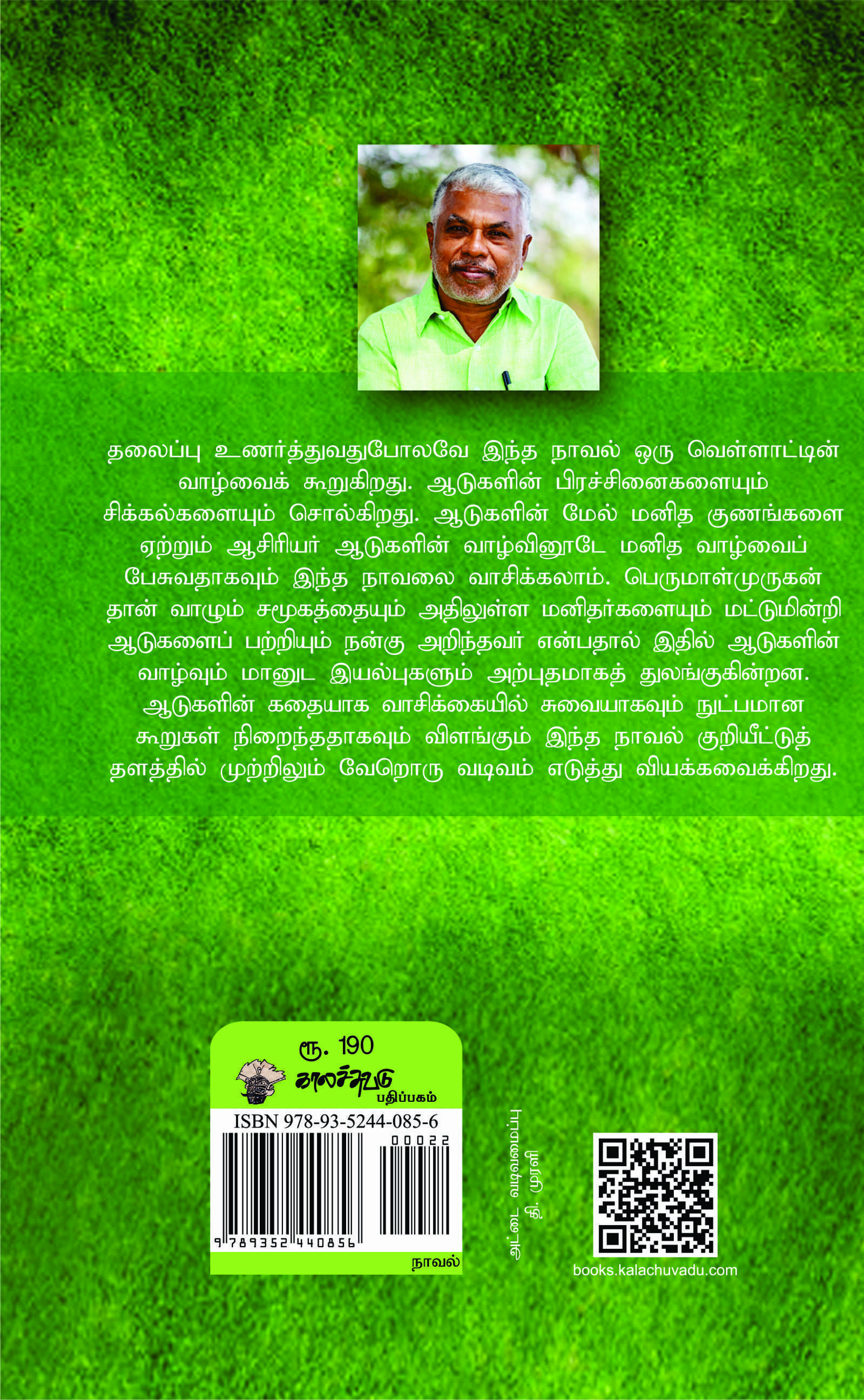 தலைப்பு உணர்த்துவதுபோலவே இந்த நாவல் ஒரு வெள்ளாட்டின் வாழ்வைக் கூறுகிறது. ஆடுகளின் பிரச்சினைகளையும் சிக்கல்களையும் சொல்கிறது. ஆடுகளின் மேல் மனித குணங்களை ஏற்றும் ஆசிரியர் ஆடுகளின் வாழ்வினூடே மனித வாழ்வைப் பேசுவதாகவும் இந்த நாவலை வாசிக்கலாம். பெருமாள்முருகன் தான் வாழும் சமூகத்தையும் அதிலுள்ள மனிதர்களையும் மட்டுமின்றி ஆடுகளைப் பற்றியும் நன்கு அறிந்தவர் என்பதால் இதில் ஆடுகளின் வாழ்வும் மானுட இயல்புகளும் அற்புதமாகத் துலங்குகின்றன. ஆடுகளின் கதையாக வாசிக்கையில் சுவையாகவும் நுட்பமான கூறுகள் நிறைந்ததாகவும் விளங்கும் இந்த நாவல் குறியீட்டுத் தளத்தில் முற்றிலும் வேறொரு வடிவம் எடுத்து வியக்கவைக்கிறது.