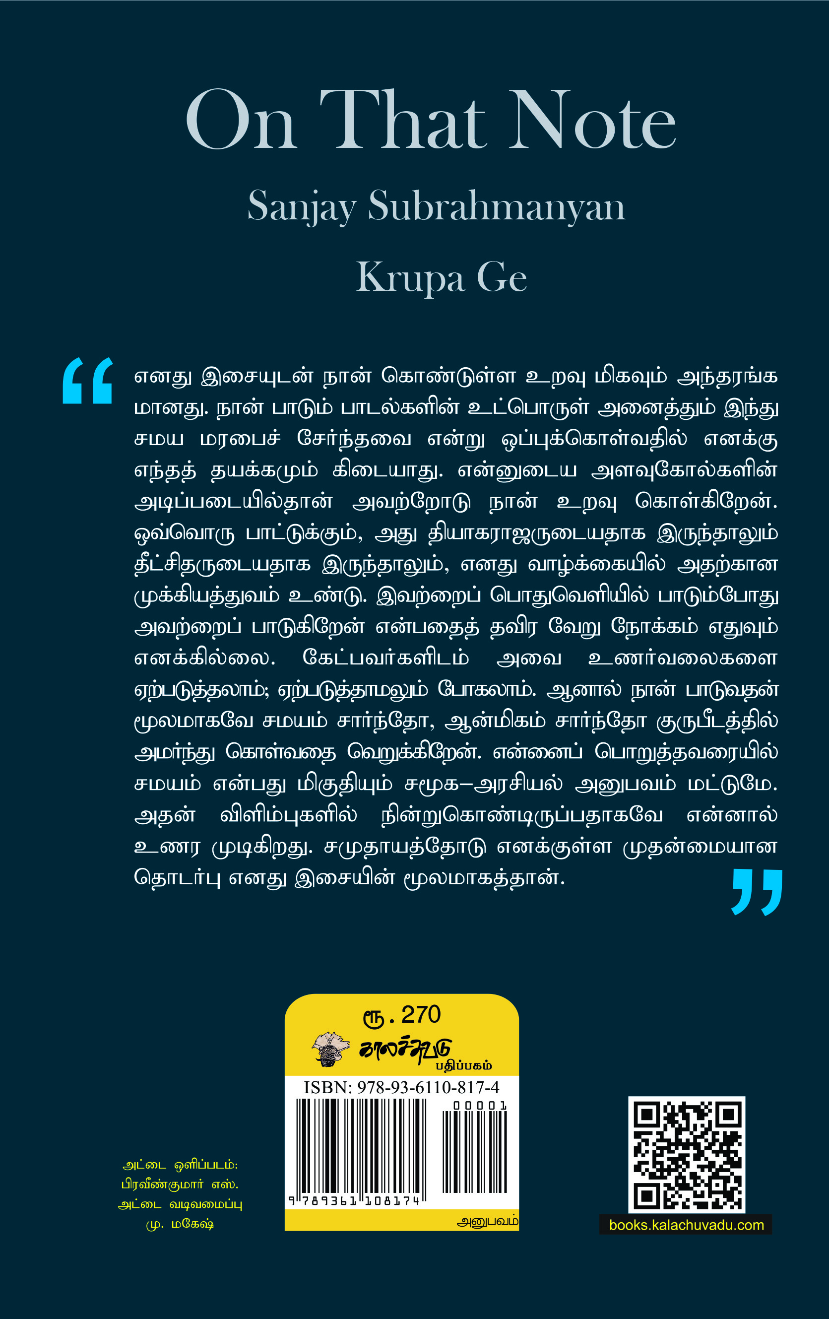 -எனது இசையுடன் நான் கொண்டுள்ள உறவு மிகவும் அந்தரங்க மானது. நான் பாடும் பாடல்களின் உட்பொருள் அனைத்தும் இந்து சமய மரபைச் சேர்ந்தவை என்று ஒப்புக்கொள்வதில் எனக்கு எந்தத் தயக்கமும் கிடையாது. என்னுடைய அளவுகோல்களின் அடிப்படையில்தான் அவற்றோடு நான் உறவு கொள்கிறேன். ஒவ்வொரு பாட்டுக்கும், அது தியாகராஜருடையதாக இருந்தாலும் தீட்சிதருடையதாக இருந்தாலும், எனது வாழ்க்கையில் அதற்கான முக்கியத்துவம் உண்டு. இவற்றைப் பொதுவெளியில் பாடும்போது அவற்றைப் பாடுகிறேன் என்பதைத் தவிர வேறு நோக்கம் எதுவும் எனக்கில்லை. கேட்பவர்களிடம் அவை உணர்வலைகளை ஏற்படுத்தலாம்; ஏற்படுத்தாமலும் போகலாம். ஆனால் நான் பாடுவதன் மூலமாகவே சமயம் சார்ந்தோ, ஆன்மிகம் சார்ந்தோ குருபீடத்தில் அமர்ந்து கொள்வதை வெறுக்கிறேன். என்னைப் பொறுத்தவரையில் சமயம் என்பது மிகுதியும் சமூக-அரசியல் அனுபவம் மட்டுமே. அதன் விளிம்புகளில் நின்றுகொண்டிருப்பதாகவே என்னால் உணர முடிகிறது. சமுதாயத்தோடு எனக்குள்ள முதன்மையான தொடர்பு எனது இசையின் மூலமாகத்தான்.