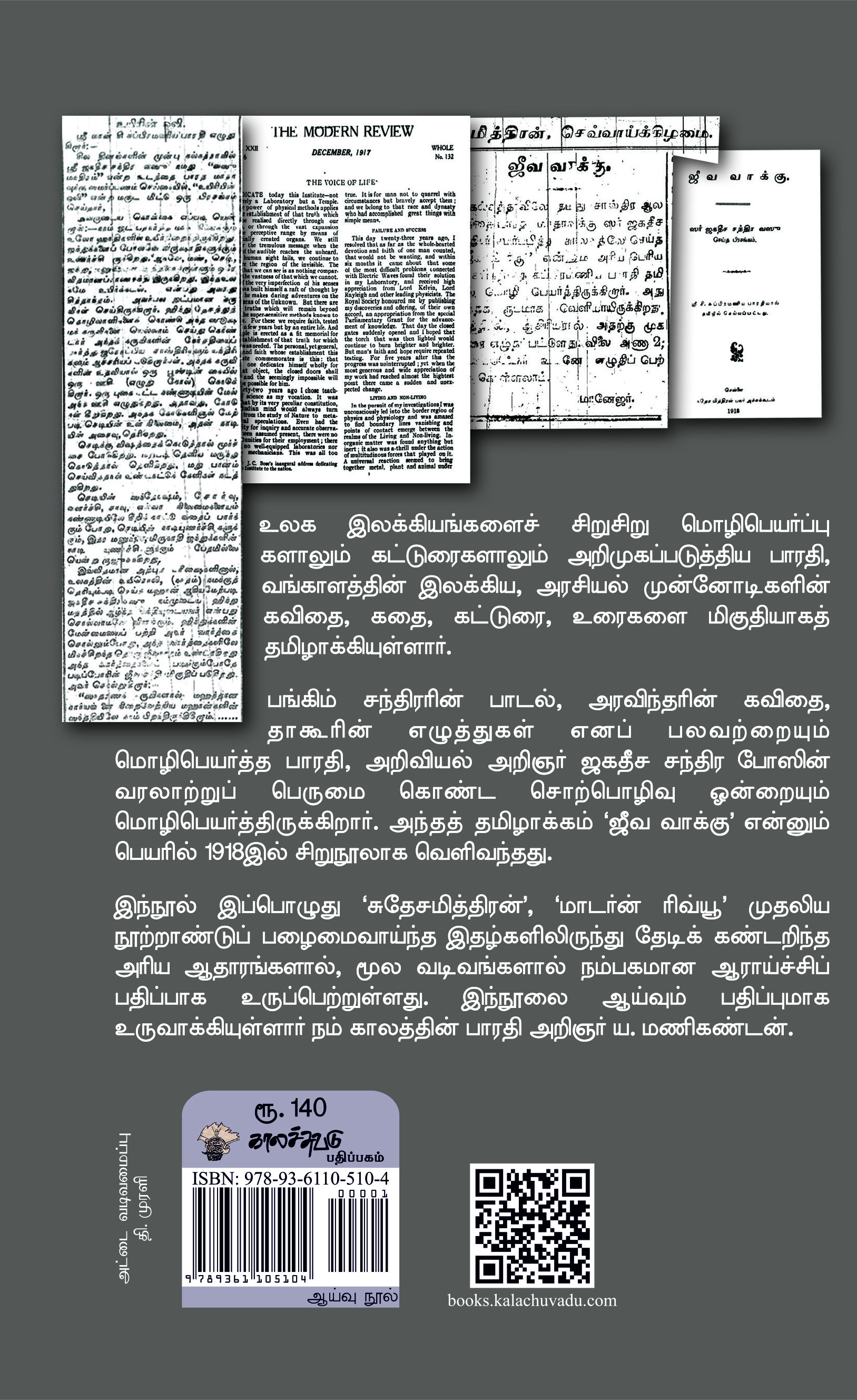 -உலக இலக்கியங்களைச் சிறுசிறு மொழிபெயர்ப்பு களாலும் கட்டுரைகளாலும் அறிமுகப்படுத்திய பாரதி, வங்காளத்தின் இலக்கிய, அரசியல் முன்னோடிகளின் கவிதை, கதை, கட்டுரை, உரைகளை மிகுதியாகத் தமிழாக்கியுள்ளார். பங்கிம் சந்திரரின் பாடல், அரவிந்தரின் கவிதை, தாகூரின் எழுத்துகள் எனப் பலவற்றையும் மொழிபெயர்த்த பாரதி, அறிவியல் அறிஞர் ஜகதீச சந்திர போஸின் வரலாற்றுப் பெருமை கொண்ட சொற்பொழிவு ஒன்றையும் மொழிபெயர்த்திருக்கிறார். அந்தத் தமிழாக்கம் ‘ஜீவ வாக்கு’ என்னும் பெயரில் 1918இல் சிறுநூலாக வெளிவந்தது. இந்நூல் இப்பொழுது ‘சுதேசமித்திரன்’, ‘மாடர்ன் ரிவ்யூ’ முதலிய நூற்றாண்டுப் பழைமைவாய்ந்த இதழ்களிலிருந்து தேடிக் கண்டறிந்த அரிய ஆதாரங்களால், மூல வடிவங்களால் நம்பகமான ஆராய்ச்சிப் பதிப்பாக உருப்பெற்றுள்ளது. இந்நூலை ஆய்வும் பதிப்புமாக உருவாக்கியுள்ளார் நம் காலத்தின் பாரதி அறிஞர் ய. மணிகண்டன்.